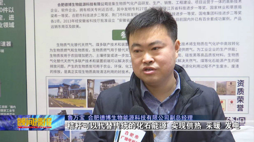 合肥电视台专访了德博副总经理鲁万宝先生,鲁总说道:生物质炭气联产技术可以将秸秆等农林废弃物“吃干榨净”变成燃气和生物炭,在能源高效利用的同时,又能用生物燃气工业化利用获得的收益来反哺农业和炭材料领域,实现了用高新技术实施生态农业或降低工业用材成本的目标。