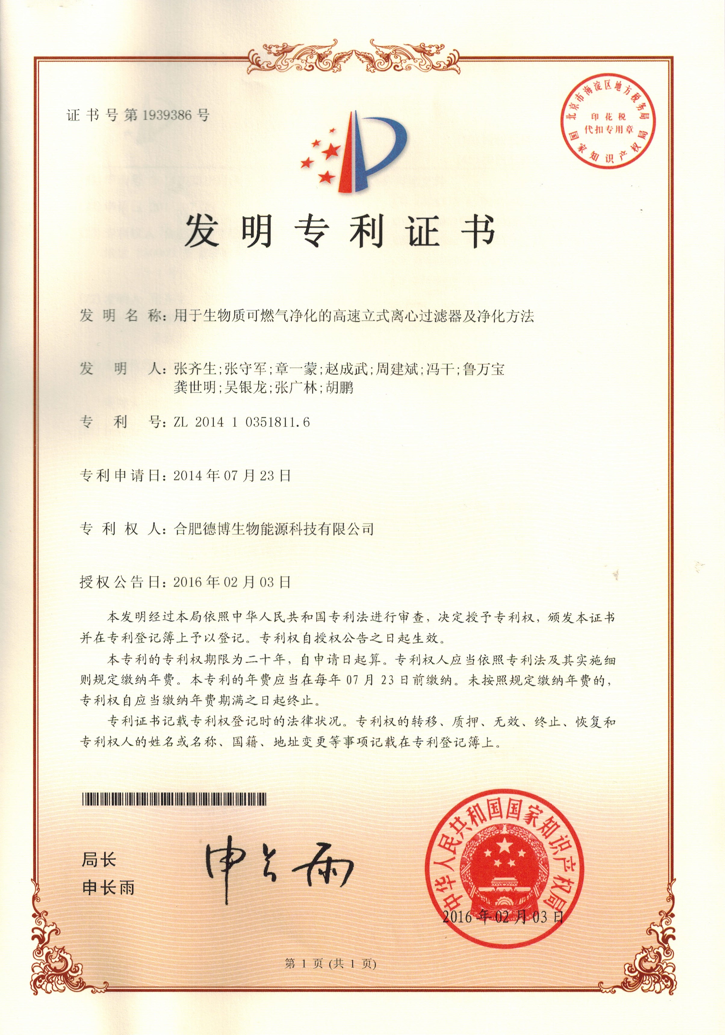 发明专利:20160203 用于生物质可燃气净化的高速立式离心过滤器及净化方法