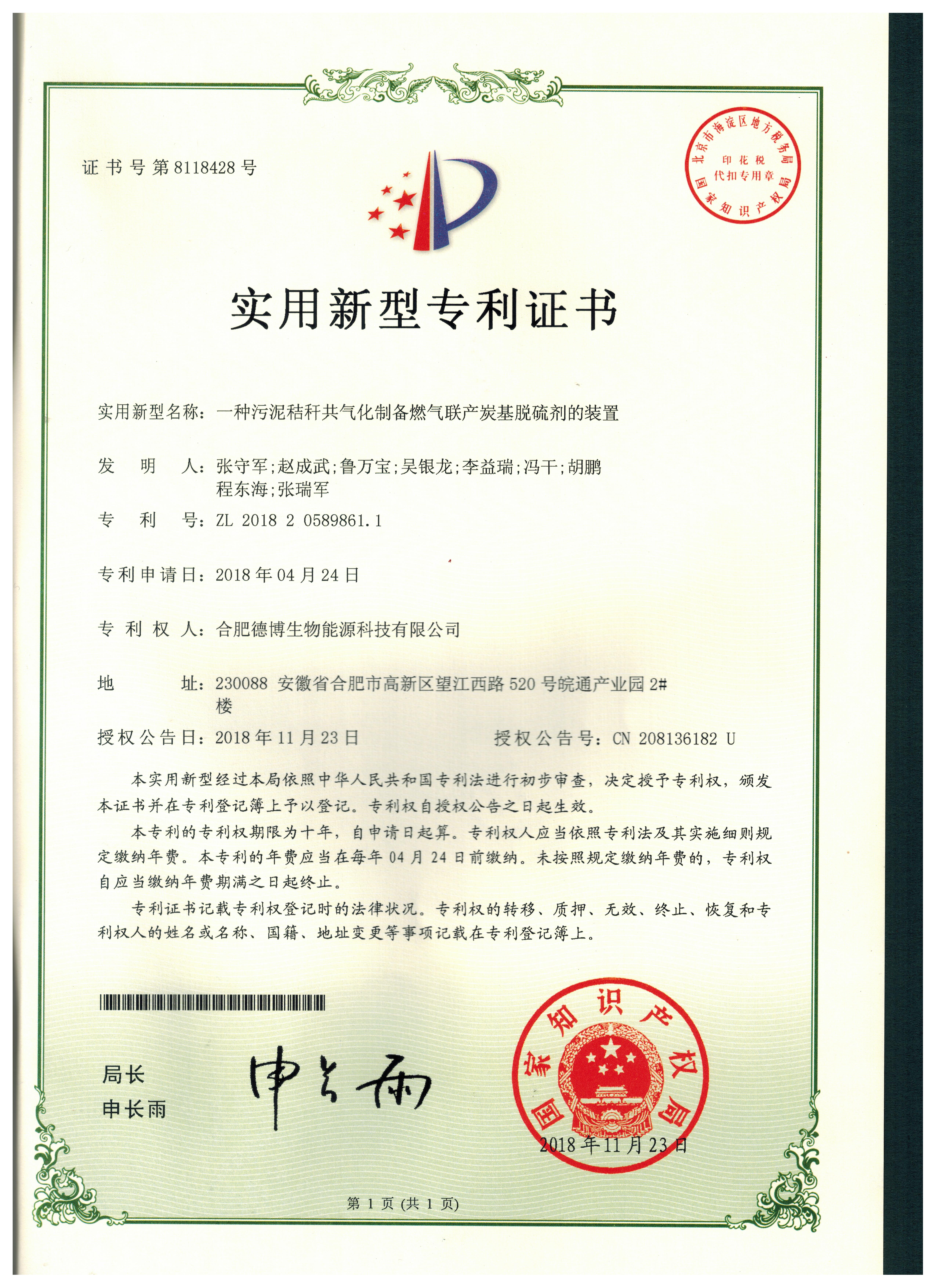 实用新型专利:20181123-一种污泥秸秆共气化制备燃气联产炭基脱硫剂的装置
