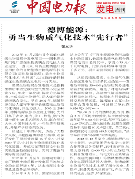 On July 24th ,2017,The China Power News focus on the publication of the biomass gasification technology typical cases 《The Debo Bioenergy : The Leader of the biomass gasification technology》.